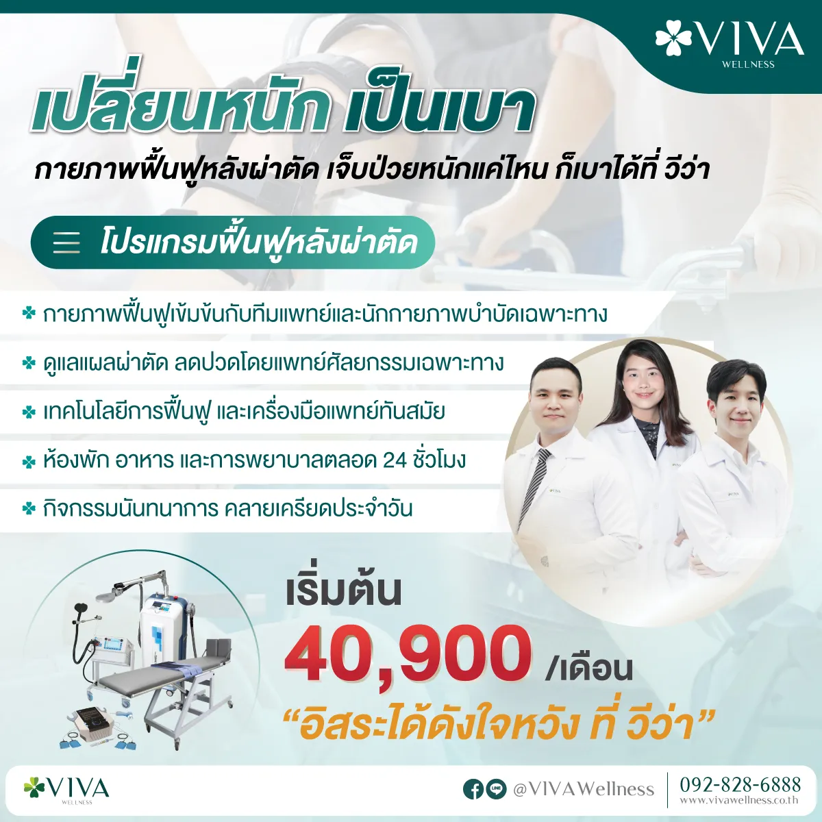 ที่ VIVA Wellness ศูนย์กายภาพบำบัด เราดูแลด้วยความเชี่ยวชาญ นำทีมโดยแพทย์เฉพาะทาง ผู้เชี่ยวชาญด้านสมองและการกายภาพฟื้นฟู ใช้เทคโนโลยีที่ทันสมัย ใส่ใจด้วยมาตรฐานระดับโรงพยาบาล พร้อมออกแบบการรักษาเฉพาะบุคคล เพราะเรามุ่งมั่นให้คุณภาพชีวิตคุณดีขึ้น ที่ “วีว่า” เราพร้อมเดินเคียงข้างคุณในทุกช่วงเวลาของการฟื้นฟู